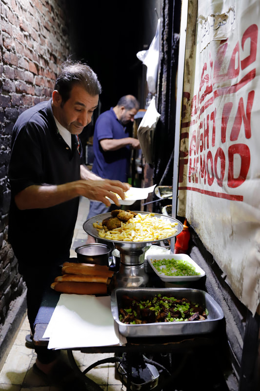 Gassenküche Treffender könnte das Wort "Gassenküche" nicht umgesetzt werden. In einer sehr engen (!) Seitengasse eines eh schon engen Souk wird frisches und äusserst schmackhaftes Essen produziert - und von Hand geschöpft. En Guete! |